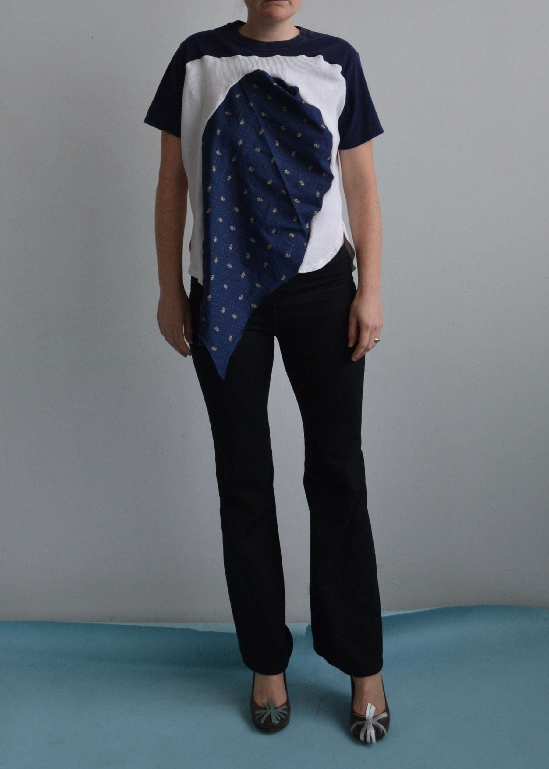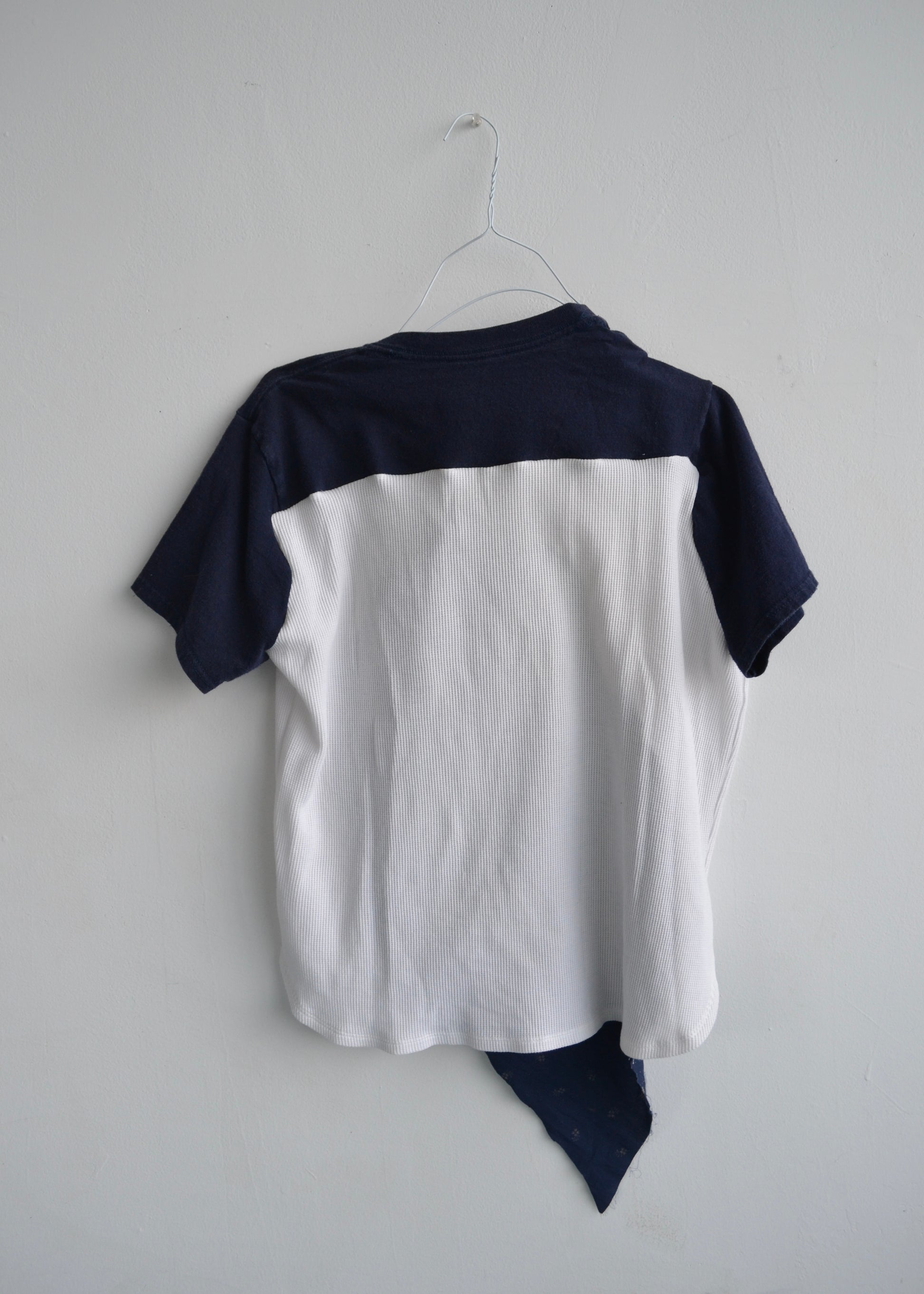 Repurposed white waffle and navy cotton t-shirts combined with antique floral fabric.