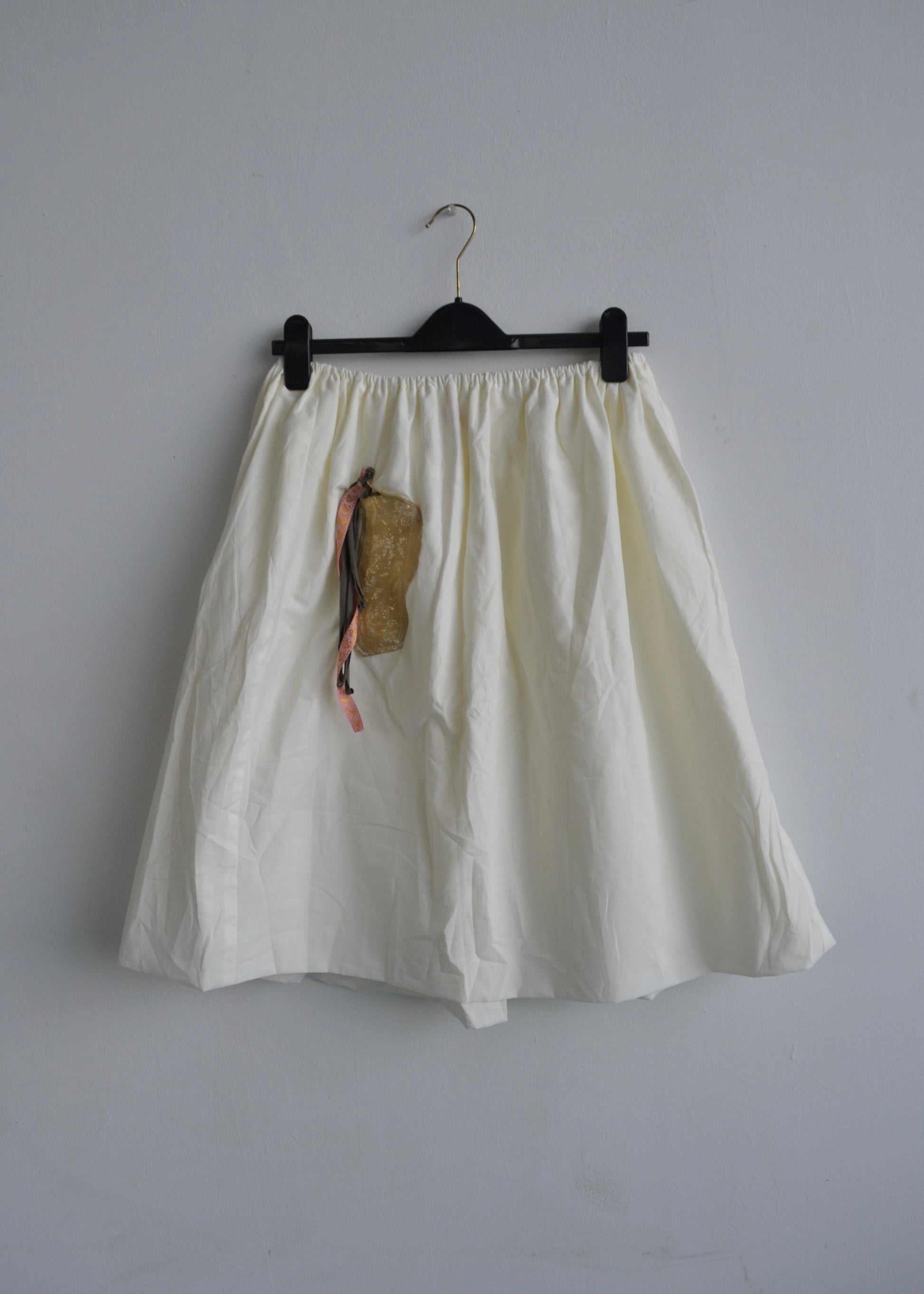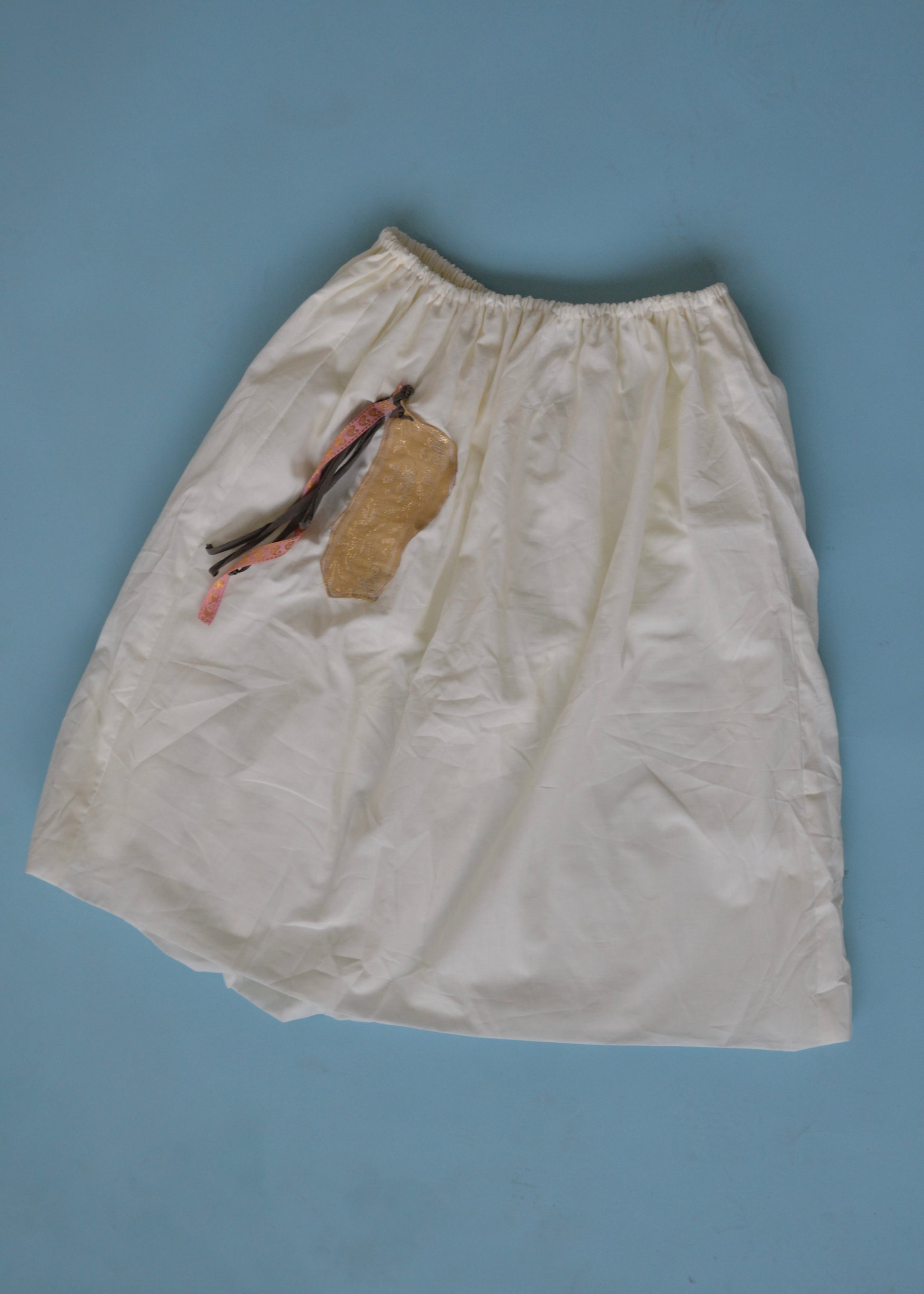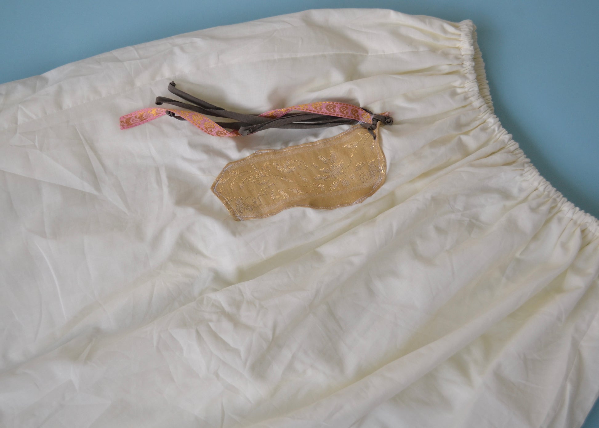 Deadstock cotton skirt with antique gold patch and ribbon tassel.