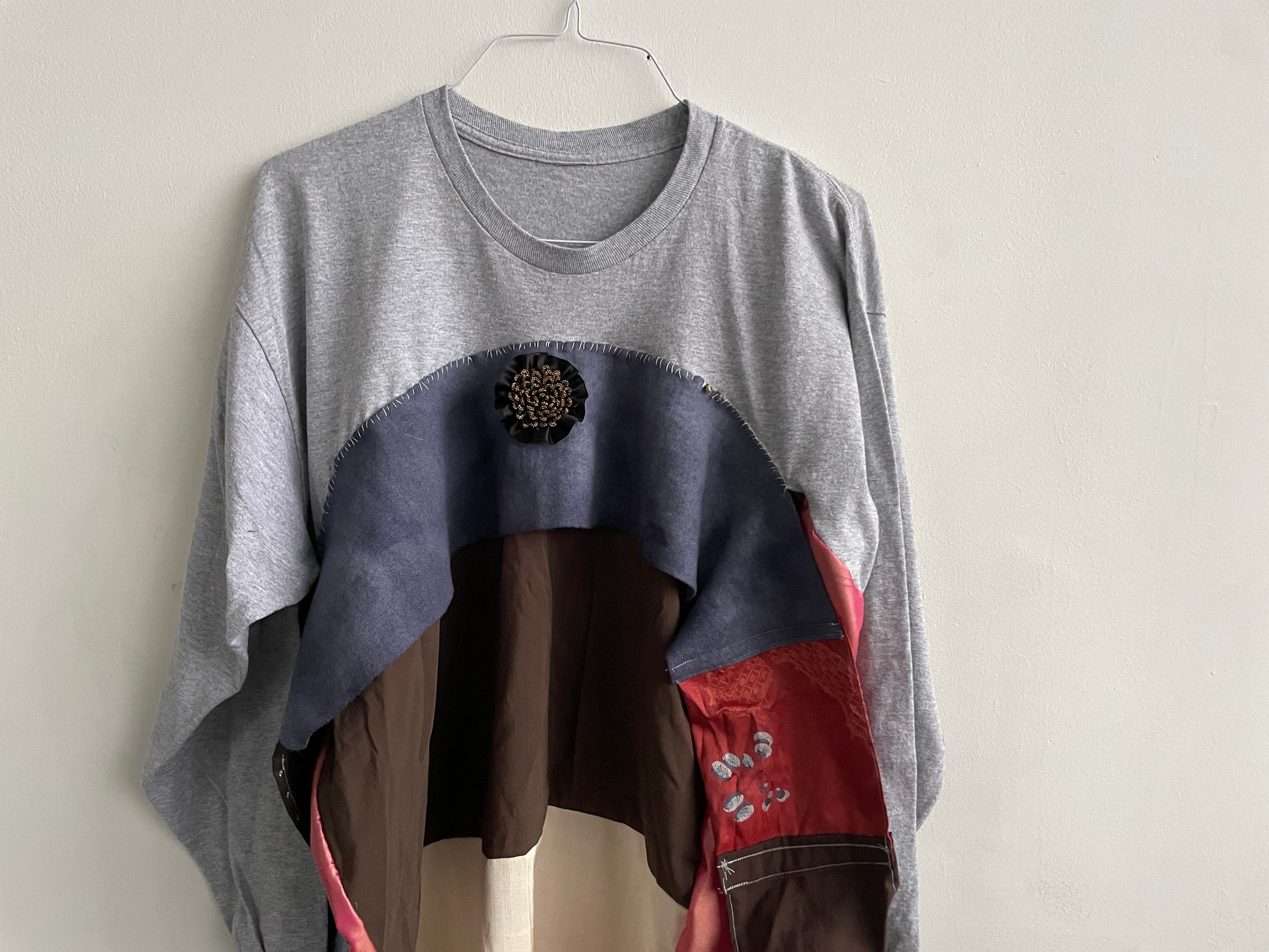 Deadstock silk, repurposed cotton jersey, antique satin flower, fabric remnants