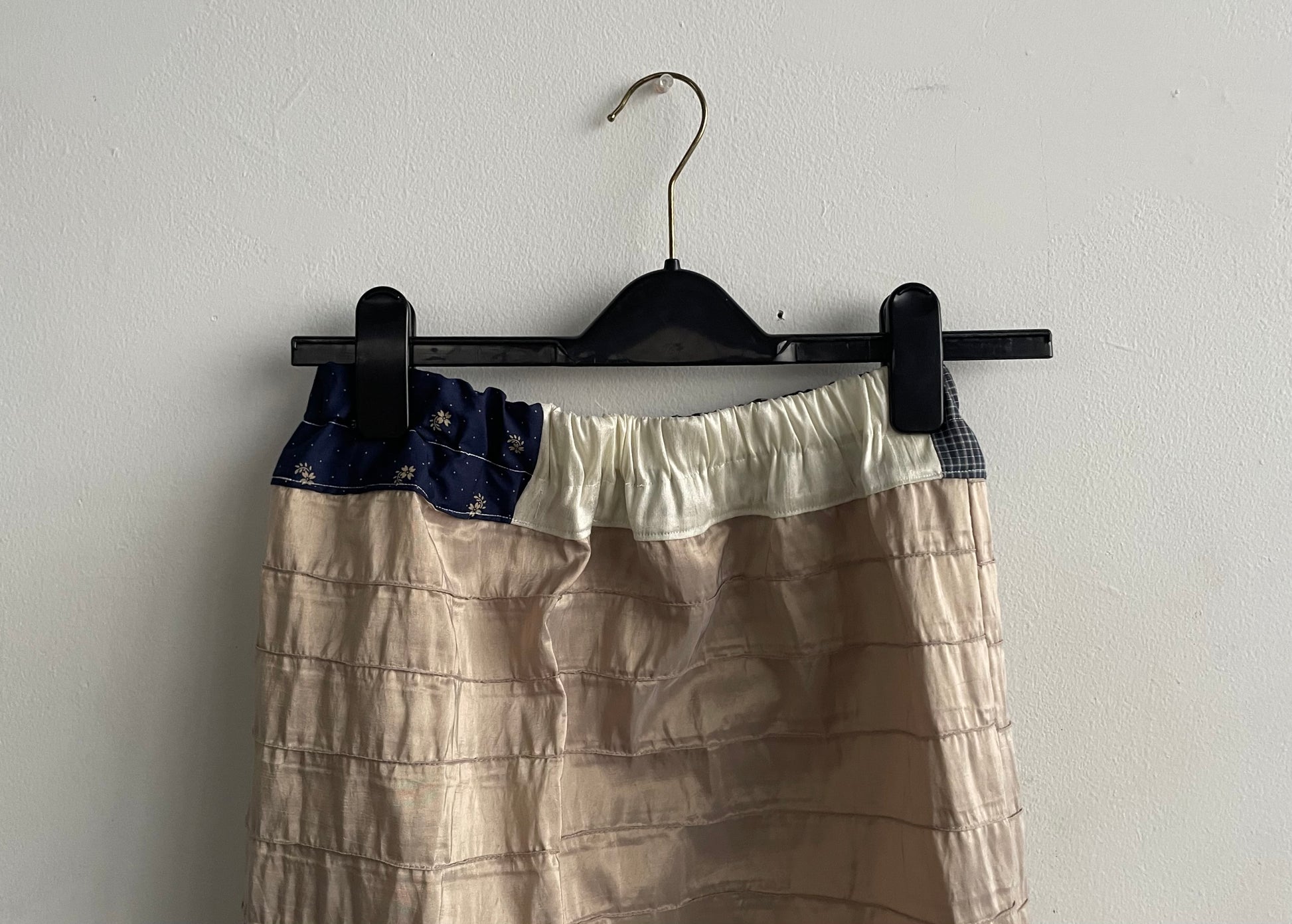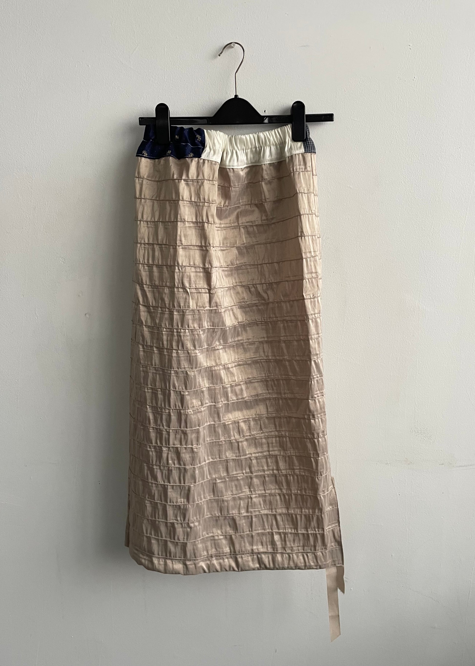 Deadstock silk, various fabric remnants, repurposed ribbon, elastic waist, ribbon slit
